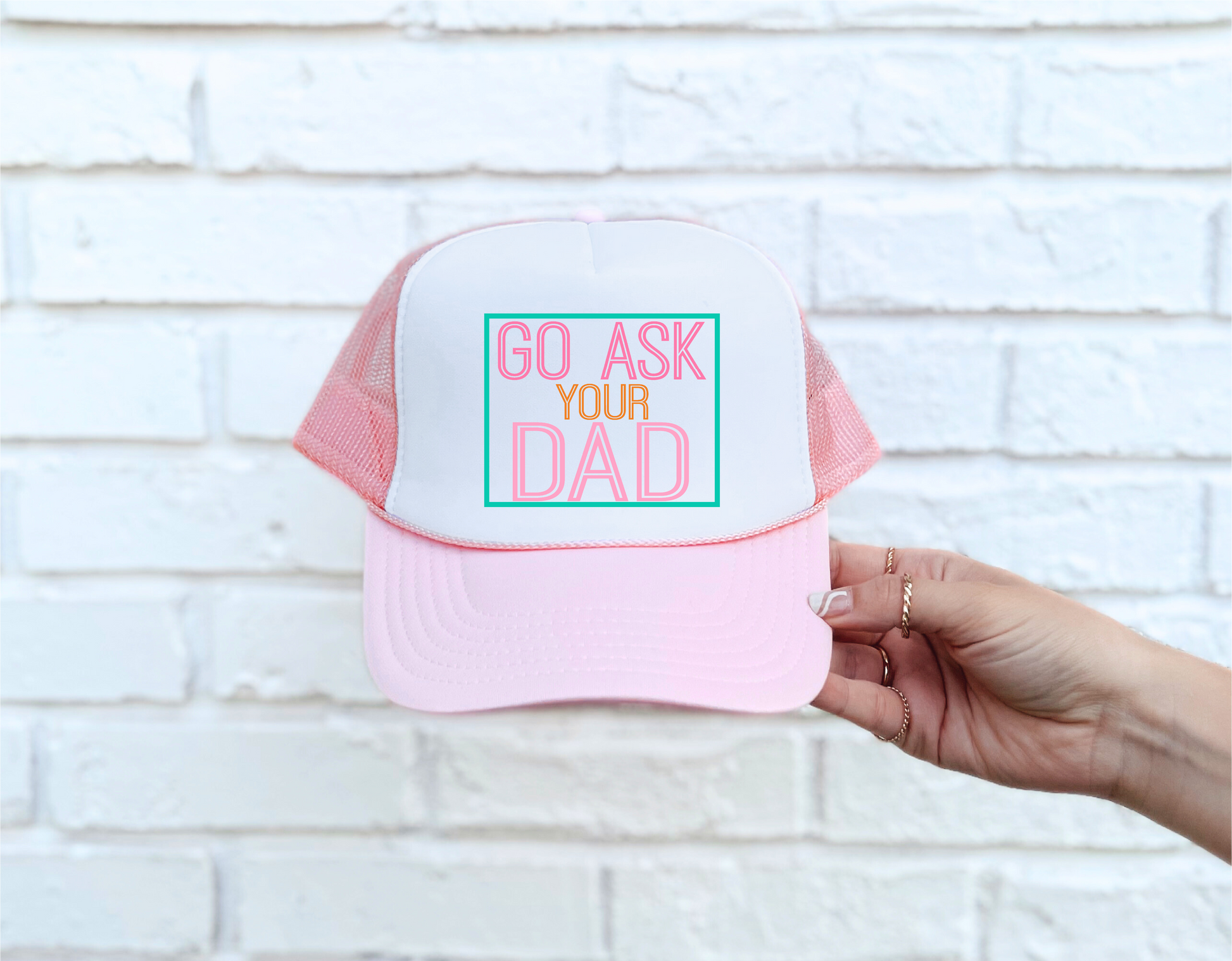 "Ask Your Dad" design direct-to-film printed on a White and Light Pink foam trucker hat. The perfect accessory to make a bold statement!